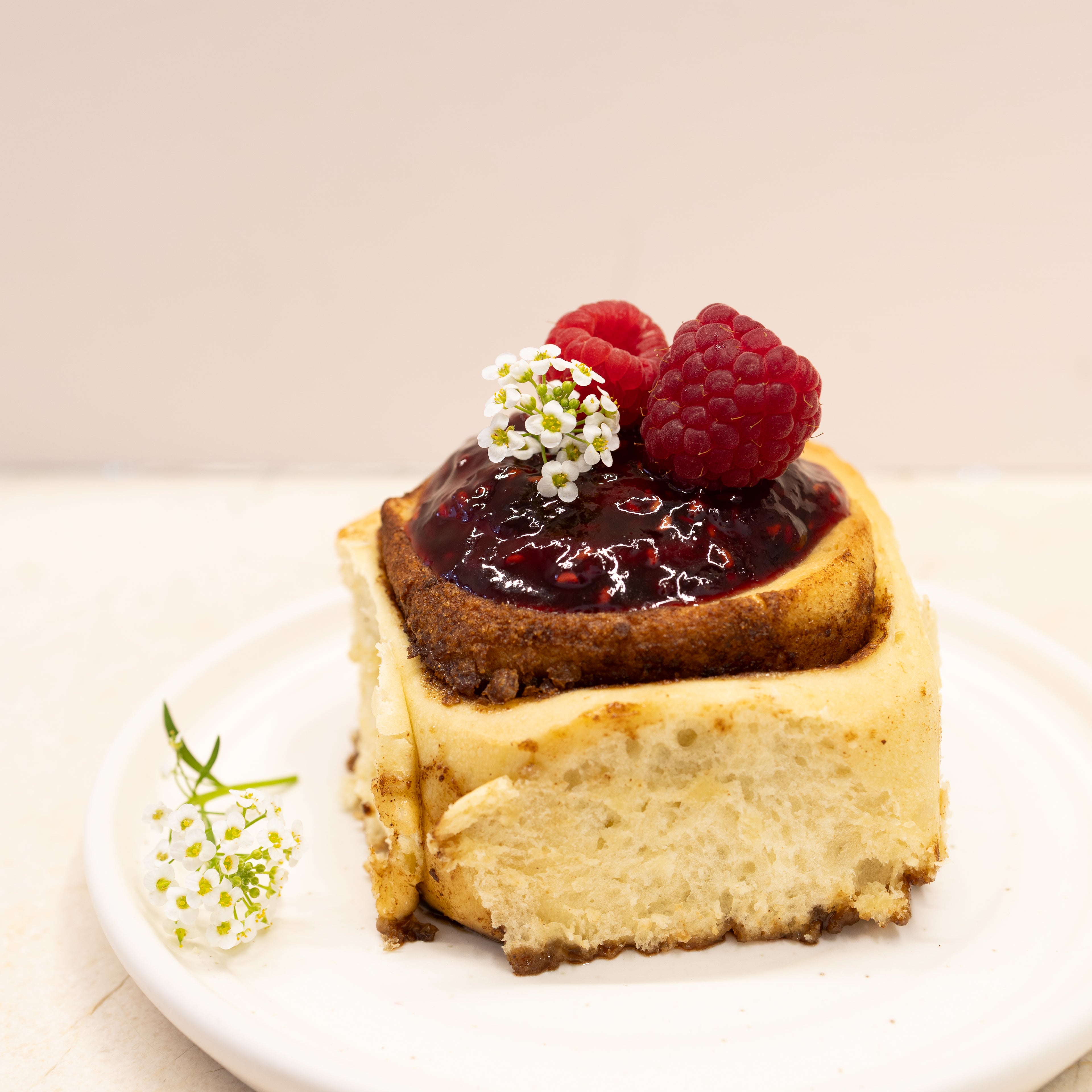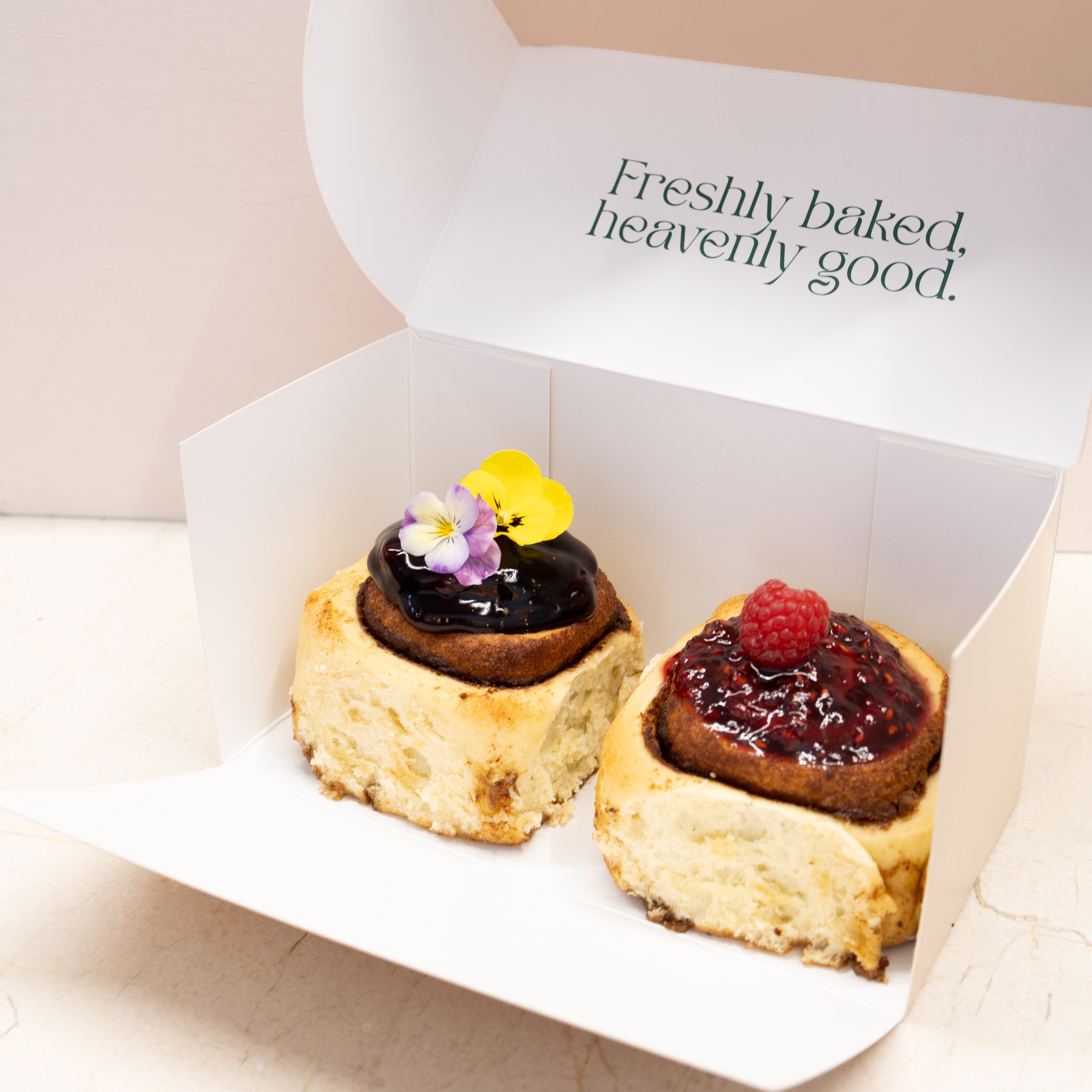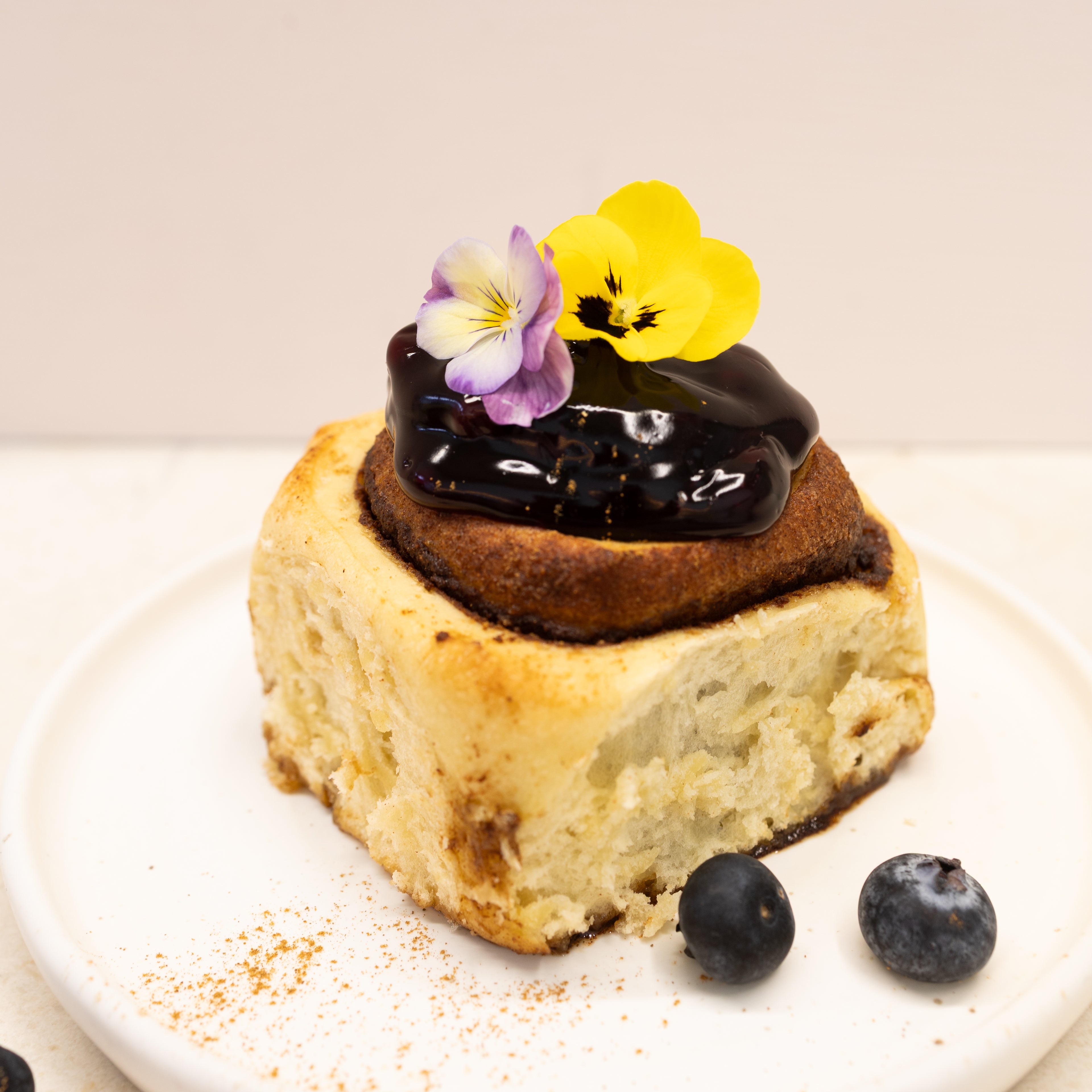 Our vegan cinnamon swirl with our signature vegan cream cheese glaze, raspberry or blueberry jam.