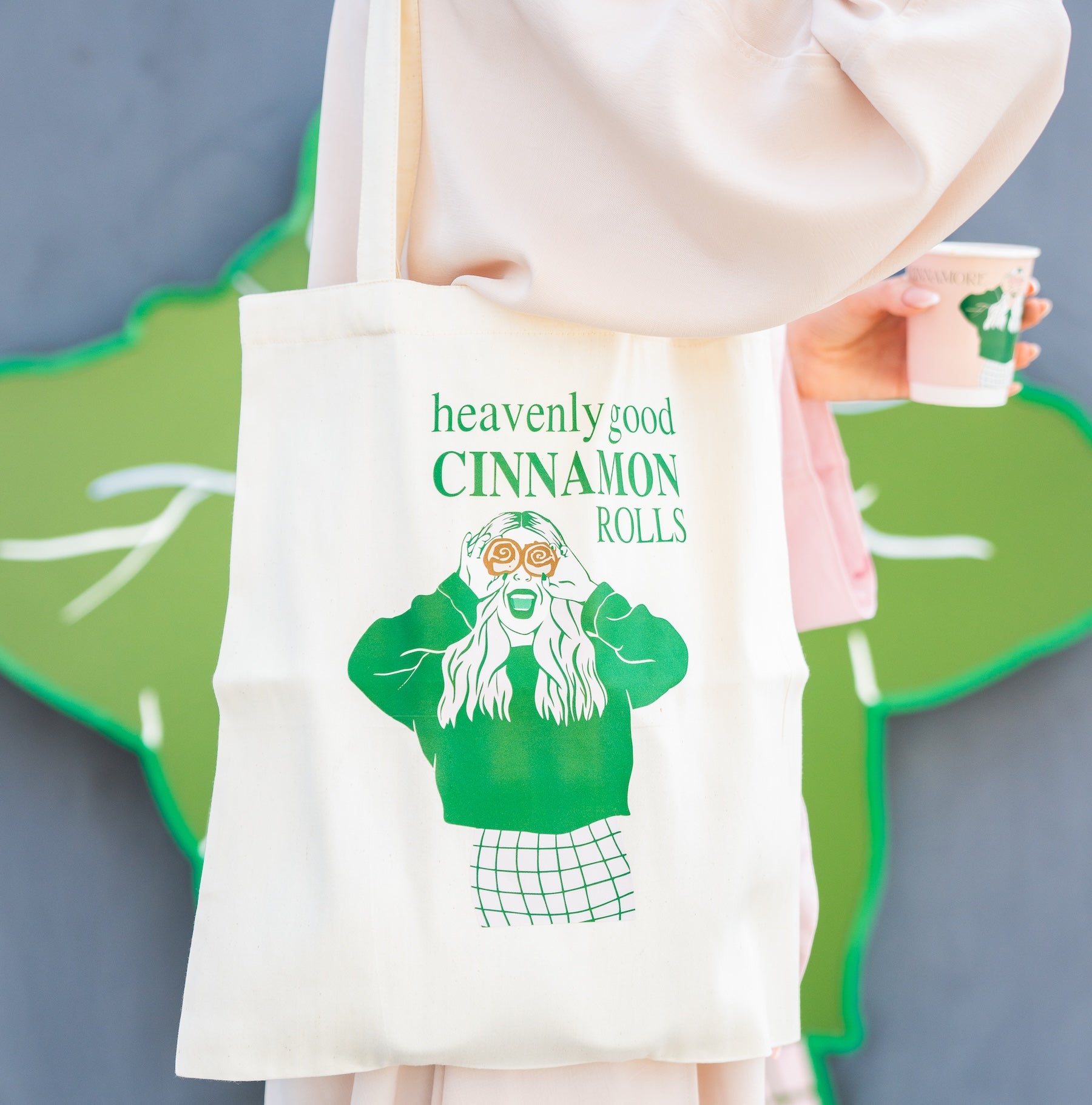 Our CINNAMORE tote bag features our Logo artwork in bold green.